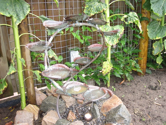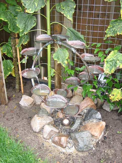 De eerste is een waterornament van koper. Ik heb een koperen leiding genomen van 15mm en de schaaltjes zijn van een koperen plaat gemaakt die ik heb opgeklopt.