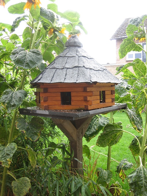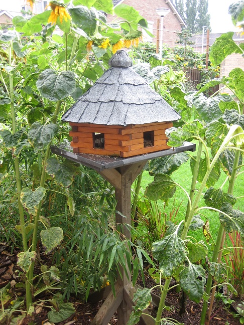 De 2de is een houten blokhut voor de vogeltjes. In het midden van de blokhut zit een pvc buis die ik boven kan vullen met vogelzaad.
