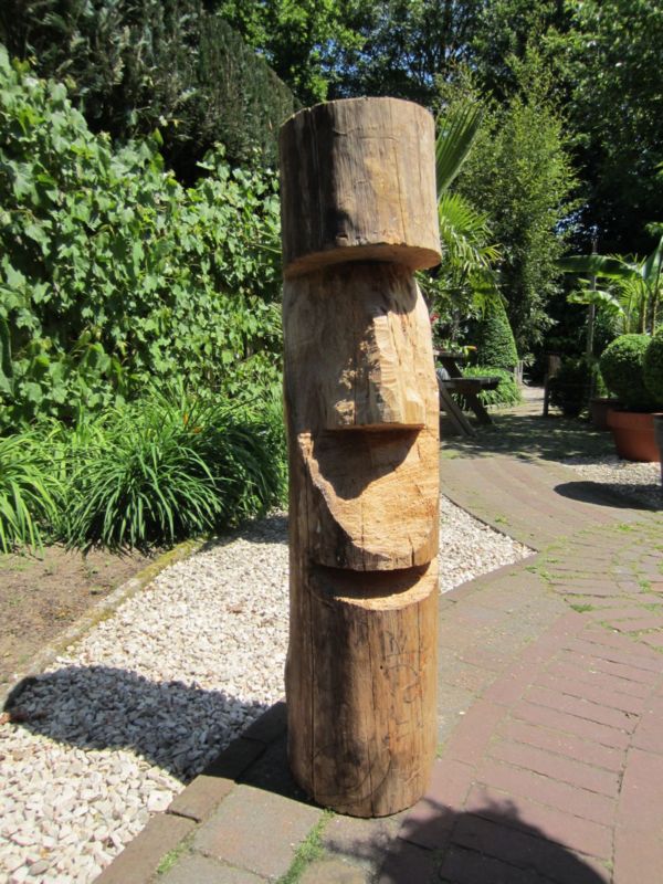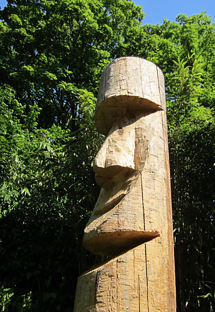 Alles behalve ideaal hout (grove den) voor een houtsnijwerk, maar ach, dat mag de pret niet drukken. De bedoeling is sowieso een oud uitziend beeld (Moai), dus lekker grof aan het werk! Ben niet van plan om er te veel tijd en energie in te steken, dus ff flink door beitelen, dan is ie gelijk vandaag klaar. Heb ik straks weer iets om ergens in een hoekie of tussen de bamboe te zetten!