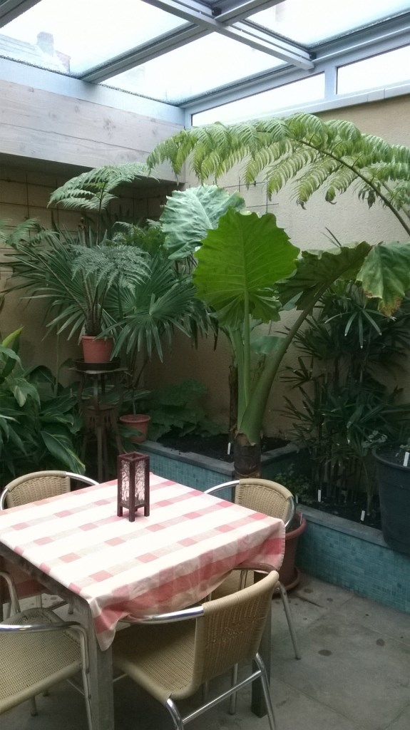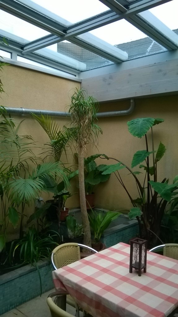 De meeste planten zitten in pot in de grond om makkelijker te wisselen en om de groei wat te beperken want het dak is maar een 3.2m à 3 meter hoog. Onderbeplanting volgt nog in het voorjaar. De bak in de rechtse achterhoek wordt binnenkort bekleed met appelblauwzeegroene tegeltjes en gevuld met water. De bedoeling is om het geheel op een minimumtemperatuur van 10°c te houden.