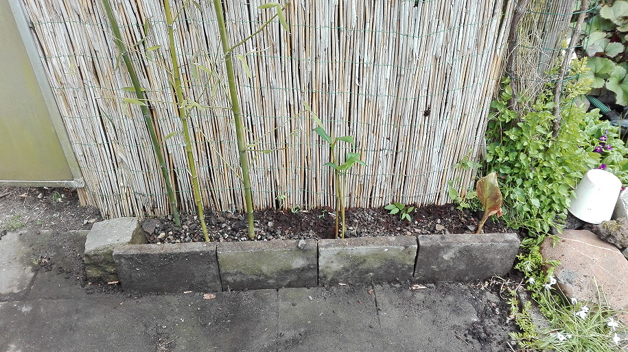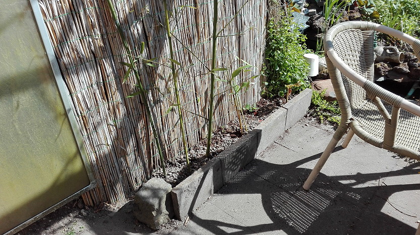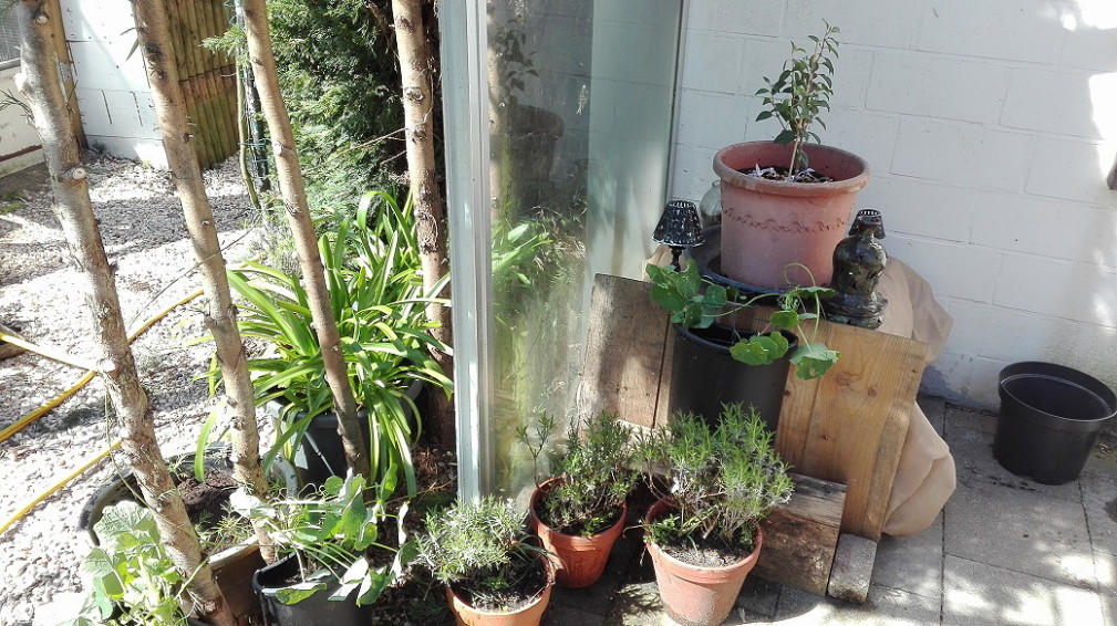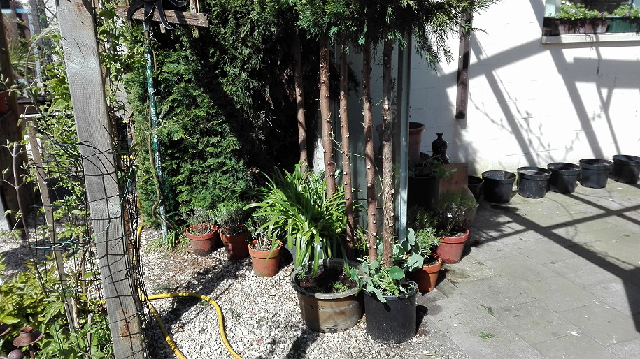 Voila eerste werken gedaan, de lege rij potten ga ik voorzien van Nicotiana sylvestris en later ga ik inderdaad de beton eens opschilderen. De muren heeft geen zin omdat ik overal hout wil tegen gaan maken. Zoals je kan zien heb ik de coniferen een scheerbeurt gegeven.