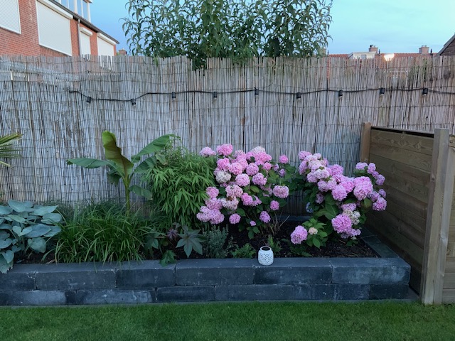 Ik zit er sterk aan te denken om 1 hortensia (de gene bij de bamboe) weg te doen. en op die plaats de lampenpoetsers gras te plaatsen, wat verder naar voren zo dat de bamboe meer ruimte krijgt en ik daar een nieuwe basjoo kan zetten. De hortensia in de hoek bekleed wel mooi de container ombouw.