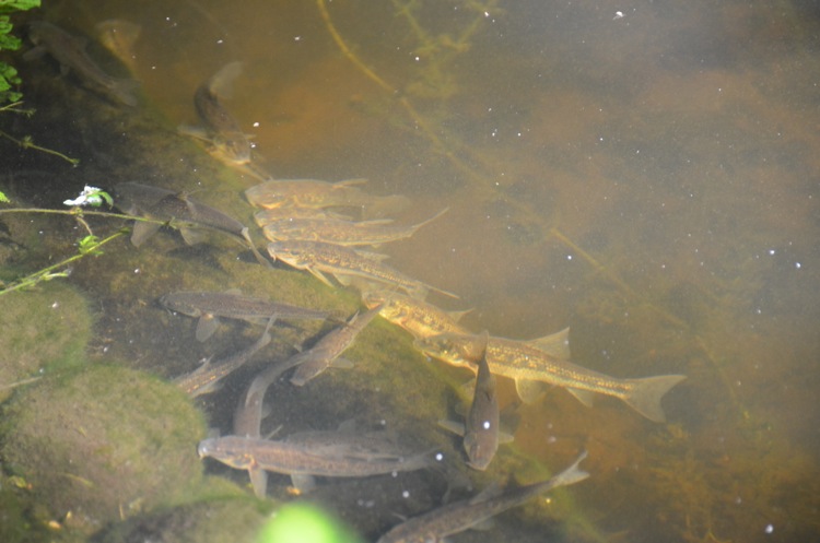 Na de aanleg werd een vijftal grondels in de vijver uitgezet. Sindsdien laten ze zich nog zelden zien. Vanmorgen in het zonlicht aan de rand van de vijver waren ze echter massaal verzameld om van de algen op de stenen te snoepen. Het visvoer (gammarus) voor de rosettes en windes vinden ze blijkbaar niet aantrekkelijk. Slechts af en toe flitst er een naar de oppervlakte om het voer te verschalken.