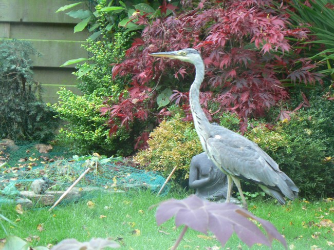 Ik heb in deze tijd altijd een net over de vijver gespannen om het blad van de bomen uit de vijver te houden .De reiger probeerde krampachtig om de vijver te lopen en struikelde een paar keer over het net .Ik wist dat hij toch niet bij de vissen kon zodoende heb ik hem ook niet weg gejaagd .Uiteindelijk vloog hij weg .