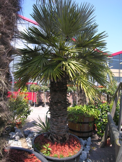 Was het maar waar, mijn palmhart riep yes, maar het verstand sputterde tegen. Deze Chamaerops met compacte kroon en een bijzonder dikke stam met een lengte van naar schatting 120 à 130 cm is waarschijnlijk niet hanteren door het enorme gewicht. Met een steekwagen red je het niet. In de tuin planten en er 's winters een verwarmde tent omheen bouwen zou een optie kunnen zijn, maar dat is niet mijn manier van doen. Bovendien kijk je er vervolgens dan overheen in plaats van tegenop ;)