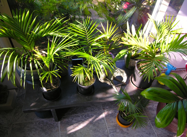 Vanwege een spintinfectie stonden deze palmen de afgelopen zomer buiten en keerden onlangs terug in huis na een overgangsperiode van enkele weken in de kas. Het gunstige effect van een vrijwel constante kamertemperatuur van 20°C is al na 2 weken zichtbaar. De uitgroei en ontplooiing van nieuwe bladeren versnelde zienderogen. De Lytocarium heb ik verplaatst naar een koelere ruimte omdat de tere veders gevoelig zijn voor de drogere lucht in de woonkamer. De andere soorten hebben daar minder last van. De Latania en de Ravenea behoren tot mijn favorieten. De Chambeyronia boert hier ook niet slecht maar ontbeert het specifieke kenmerk van het rooduitlopende juveniele blad. Binnenhuis is er een verhoogd risico op aantastingen door ongedierte, spint en dopluis met name. De palmen schuilen onder een grote Latania lontaroides. Deze huisvest zeer waarschijnlijk een kleine spintpopulatie, waar deze palmsoort zelf weinig last van ondervindt. De relatieve luchtvochtigheid is nu nog 65 %, maar daalt als het kouder wordt. Met een hygrostaat houd ik de waarde op minimaal 50%.