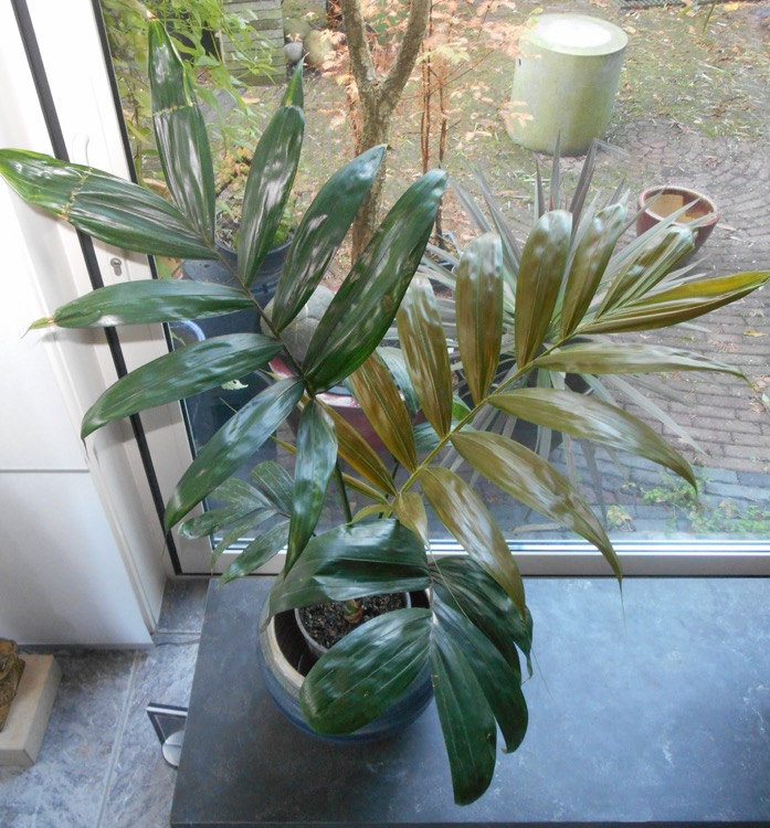 Het nieuwe blad bij Chambeyronia kondigde zich al geruime tijd aan en op de valreep van de zomer is het nu zo ver. Het heeft er 10 maanden overgedaan. In de woonkamer waar deze palm staat, heerst een vrijwel constante temperatuur en wordt het zelfs tijdens de heetste dagen niet warmer dan 24°C.