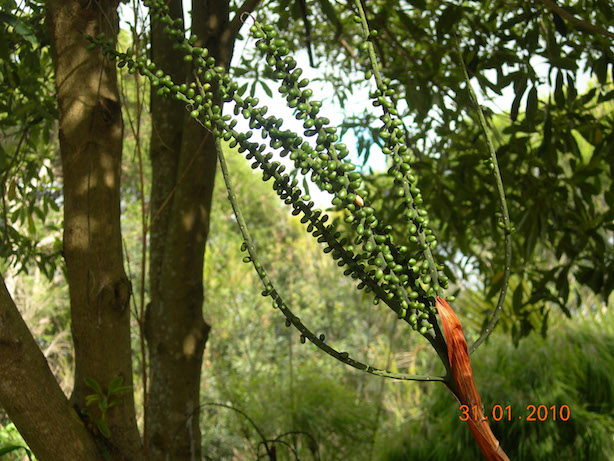 Het lijkt mij de typische bloei van een Chamaedorea: korrelig, klein en lang op stengel. Voorlopig heb ik er sterke twijfels over dat het een Ravenea is.