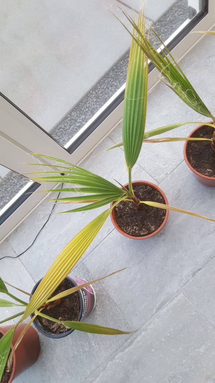 Afgelopen voorjaar heb ik een aantal Washingtonia Robusta gezaaid. Zij hebben altijd in de serre gestaan, deze heeft weliswaar vloerverwarming maar als het bewolkt is blijft het er koel. De palmbomen groeiden goed en omdat het inmiddels kouder en minder lang licht is, geef ik ze nog maar weinig water. In de serre is het ondanks de vloerverwarming ongeveer 15 graden. Sinds ongeveer twee weken zijn de bladeren echter geel aan het verkleuren.