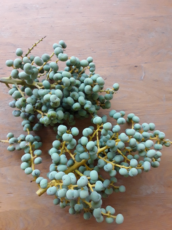 Rijpe zaden krijgen een diepblauwe kleur. Of deze voldoende zijn ontwikkeld, is de vraag. Hier blijven ze tot het voorjaar hangen. Je kunt het uitproberen. Ontdoe het zaad van het vlies want dat bevat vermoedelijk een factor die de kieming verhindert. Kieming is bij 20 - 25°C.