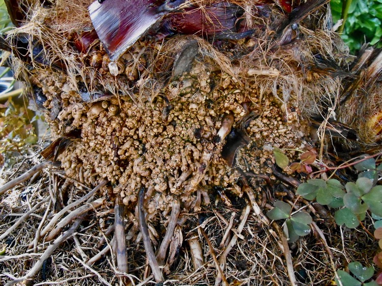 We zullen dit allemaal weleens gezien hebben, wortels die bovengronds bij palmen uit de stam verschijnen waarvan de groei stagneert. Een duidelijk voorbeeld hiervan is te zien bij Chamaerops humilis waarbij op de stambasis talloze adventiefwortels ontspruiten. Omdat deze 'luchtwortels' geen contact met de vochtige aarde kunnen maken, stopt de uitgroei en drogen ze uit. De remedie die soms kan worden toegepast is de palm dieper in de grond planten. Dat is met name zinvol als de palm door het toenemend gewicht van de kroon instabiel dreigt te raken, zodat nieuw te vormen wortels voor een betere verankering zorgen. Als een grotere kuip geen optie is, kan een kraag gevuld met vochtige aarde soms een oplossing bieden.