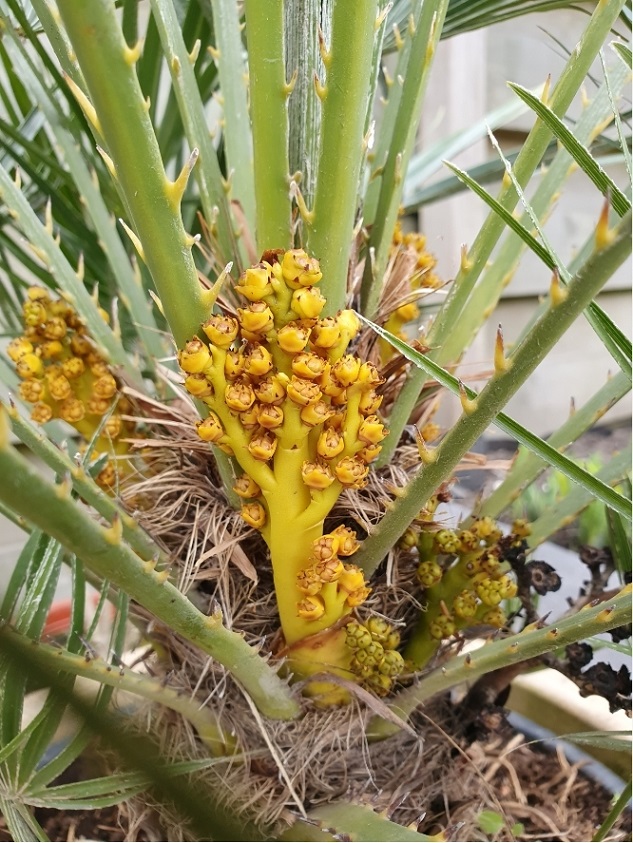 Er zitten bloemtakjes in een van m'n Chamaerops humilis.
