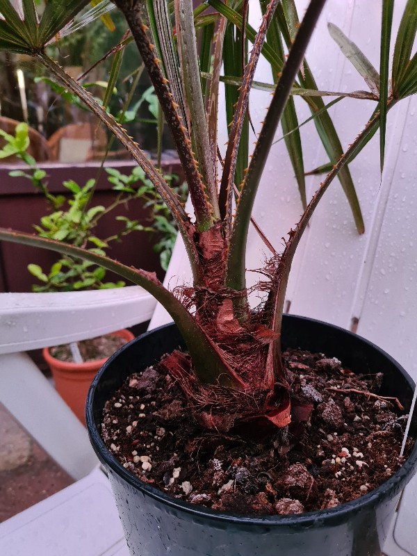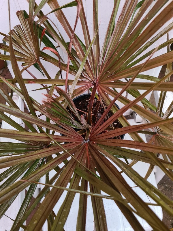 Die palm - net als de twee die hier staan (vrijwel helemaal groen, maar vorig jaar in de tuin wel significant rood) is gekocht als L. decipiens. Inmiddels is L. decipiens hernoemd naar Livistona decora.