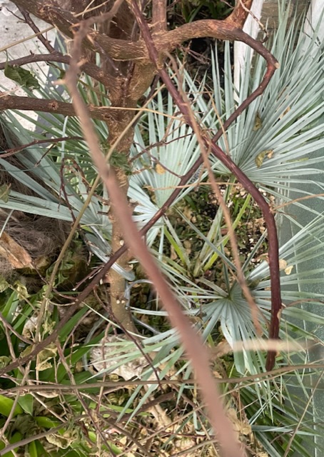 En dan het onlogische , deze winter twee brahea's die te kort bij mijn butia staan overgelaten aan de weerelementen (ooit potgrond met zaden in uitgekiept aan de butia)