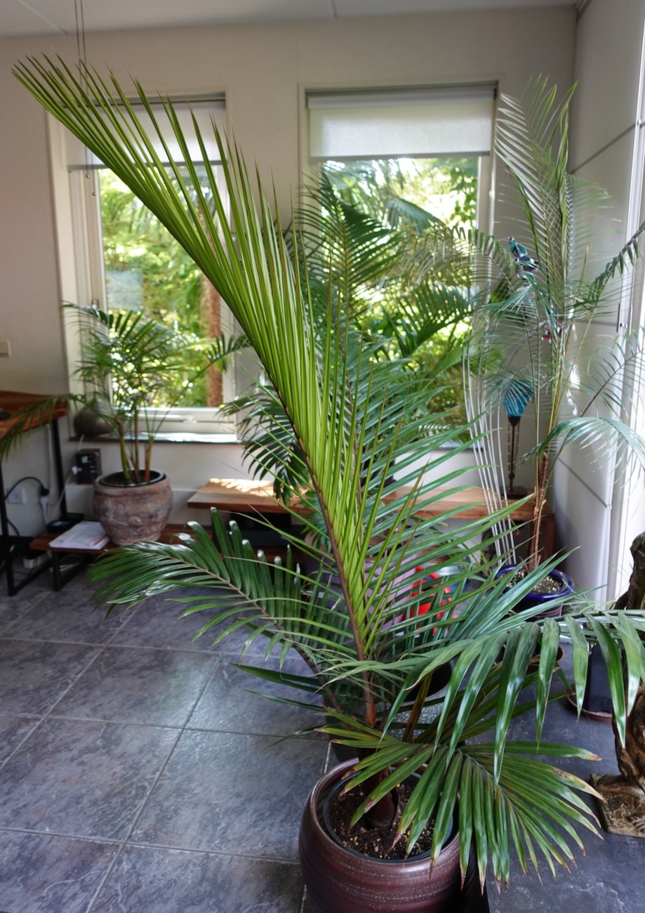 Het is weer zover een jaarlijkse gebeurtenis, de ontplooiing van een nieuw blad in de Teddy Bear palm die inmiddels bij het geslacht Chrysalidocarpus is ondergebracht. De palm die inheems is op Madagascar doet het uitstekend als kamerpalm. Op de achtergrond rechts is ook Syagrus weddellianum zichtbaar.. Deze soort werd vroeger regelmatig aangeboden in een rode kleipot met naalden bosgrond afkomstig van een Belgische kweker. Nu wordt deze makkelijke en snelgroeiende palm zelden aangeboden.