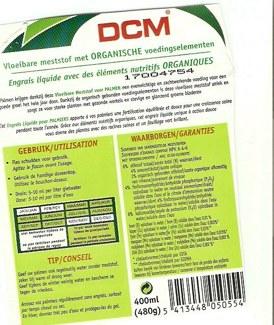 De producten van DCM zijn doorgaans erg goed hoor. Dus als je speciale vloeibare meststof hebt gekocht voor je palmbomen, dan is dit wel in orde. Je palmen zullen het graag opnemen. In de winter hoef je geen mest toe te dienen. In de lente en zomer, één keer per maand. Als mijn palm bloeit, dan geef ik ze wat extra meststof. (wel de juiste verhouding behouden!)