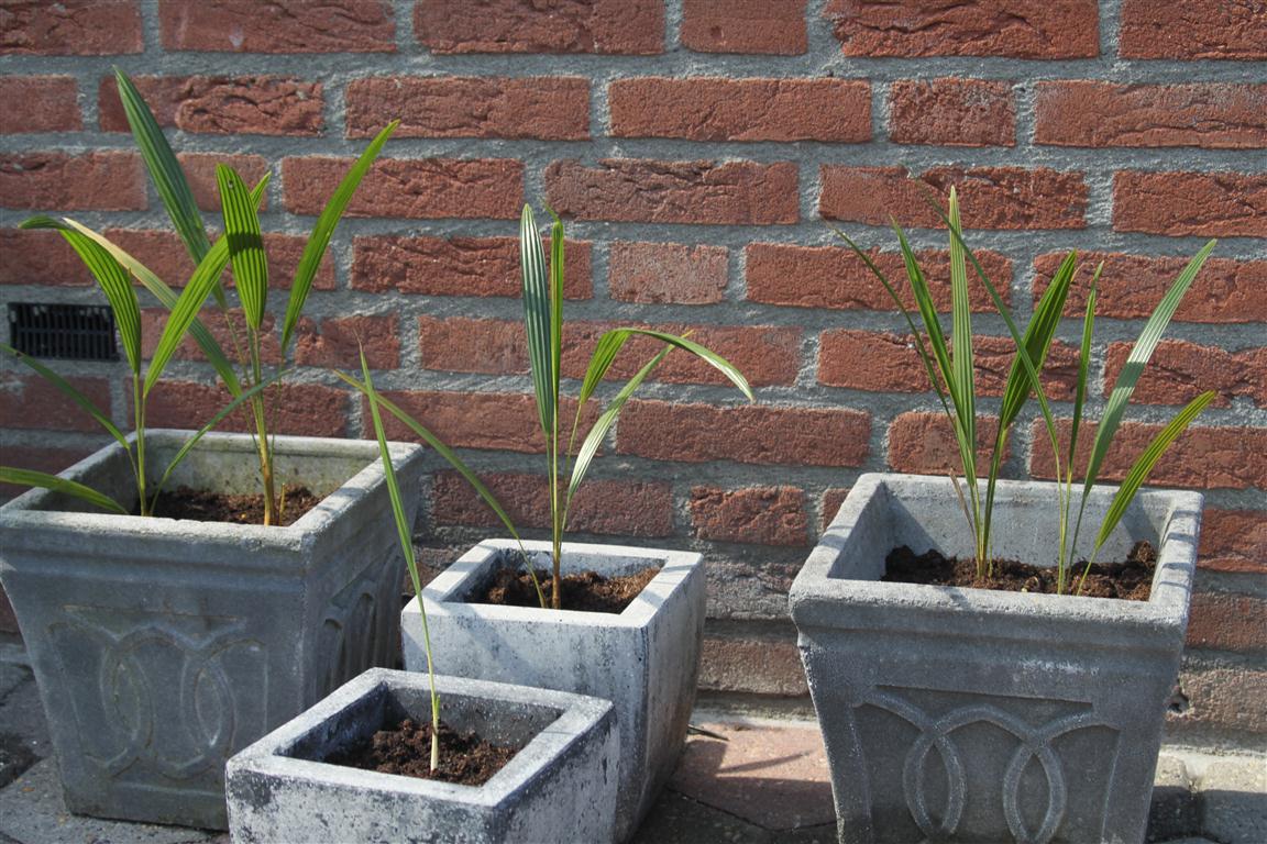 Ik zou de palmen niet samen in een pot zetten,ze gaan elkaar be-concureren om ruimte en voedingsstoffen en dat komt de plantjes niet ten goede.