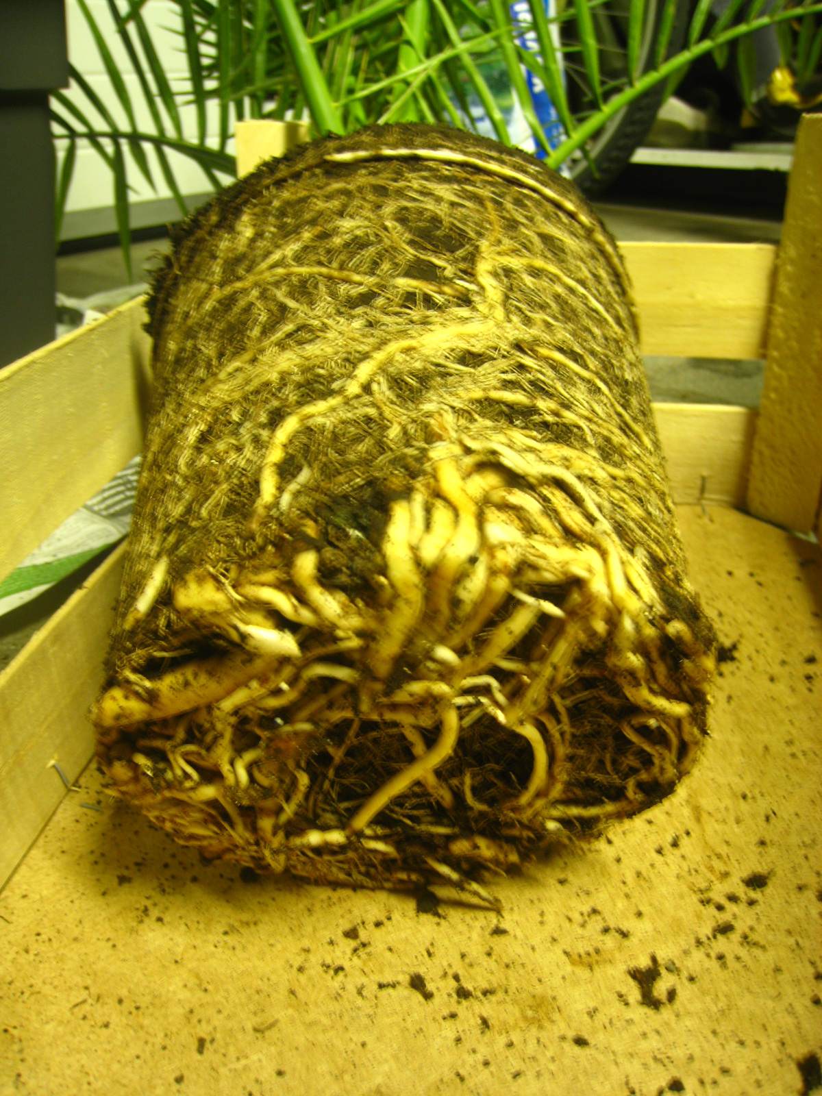 Als je het doet haal ze er voorzichtig uit, vul een grotere pot met goede grond, duw de pot (die van de palm komt) er even in en dan heb je de juiste vorm in het zand waar de palm dan mooi in past ;) Geen water meer geven dan !! De nieuwe potgrond is vochtig genoeg om heel de winter door te komen ! succes !