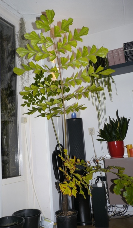 Voor de overwintering staat de palm in een koele onverwarmde kamer (10-15°C) en krijgt tot mijn verrassing opnieuw een blad erbij. Het is er schemerdonker, maar de overwinterende kuippalmen hebben in de zomer blijkbaar genoeg energie opgedaan om hun kunstje te herhalen. Het is kennelijk geen fabeltje dat kamerplanten extra energie kunnen opdoen wanneer ze 's zomers een periode buiten verblijven. Je leest deze aanbeveling in oudere plantenboeken (Daan Smit en Engelstalig: 'a good spell in de the open air'). Vrij vertaald volgens Google, betekent dit 'een goede spreuk in de buitenlucht'