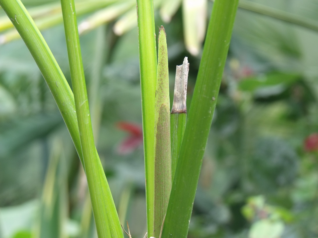 Bij een van mijn Howea toefs komen nu 2 bladeren uit. Een individu loopt roodbruin uit en heeft donkerder getinte bladstelen, de andere heeft de gewone lichtgroene kleur. Wat opvalt bij deze soort, is dat het blad al begint te ontplooien bij een nog maar gedeeltelijke uitgroei van de speer. Fysiologisch is dat gunstig voor de palm, omdat tijdens de verdere uitgroei en ontplooiing van het blad dit al een bijdrage levert aan de energieproductie ofwel de assimilatie. Naar verwachting zullen in reactie op het verblijf buiten, de bladstelen minder lang uitgroeien als bij de bladeren die in de kas zijn gegroeid.