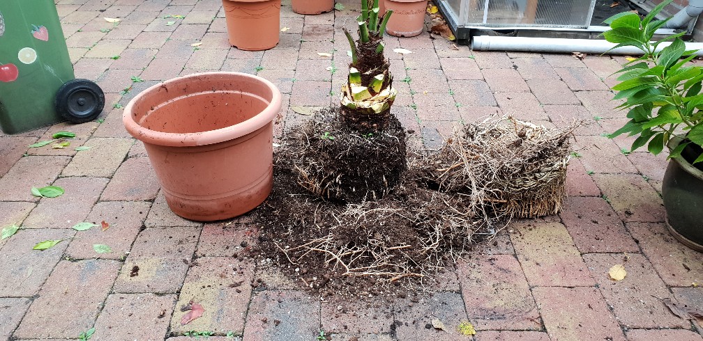 Deze wortel snoei bij zowel de phoenix canariensis al 4 x als de robusta reeds 2 x uitgevoerd alvorens deze naar binnen ging in Oktober/November in de serre van 15-20 graden.