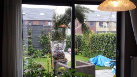 Uitzicht vanuit de woonkamer op de palm en het plantgat