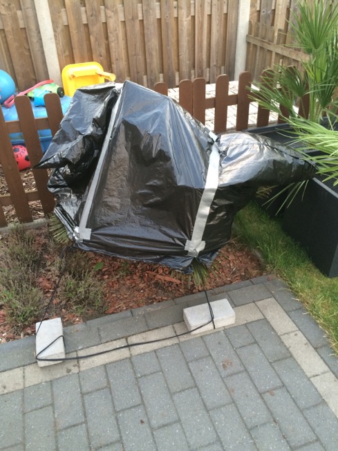 Dit jaar heb ik dus in de winter een hoes erover gedaan en die weer verwijderd bij gewoon weer en ook als het ging stormen met rukwinden zodat het niet gaat vliegen.