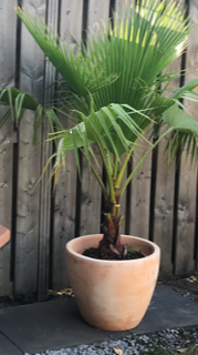 Voor wat betreft de palm; deze hebben we nu in het kuipje laten staan waarin hij is gekocht. Deze hebben we vervolgens in een grote plantenbak gezet.