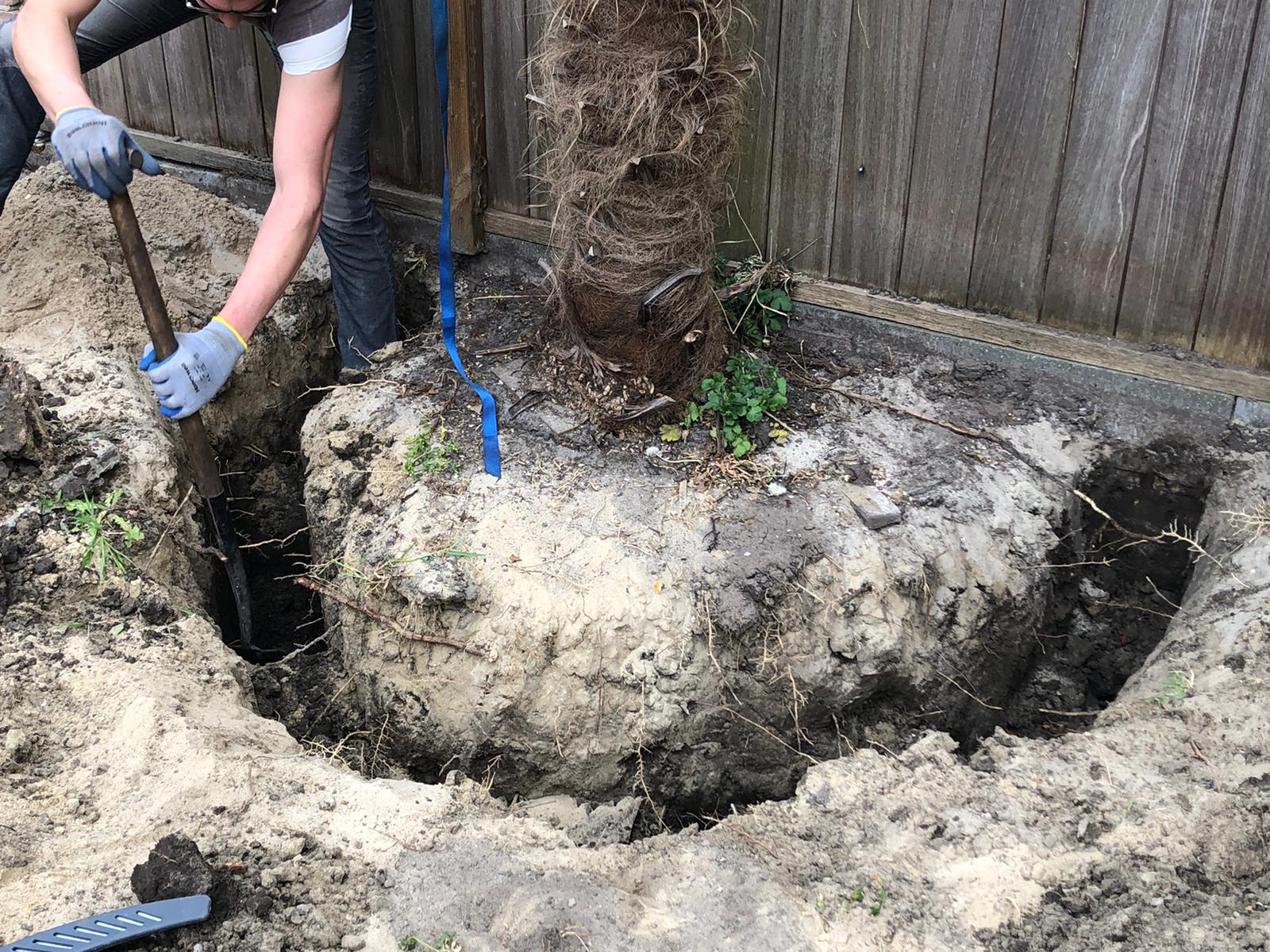Een ruime geul gegraven rondom de boom, totdat we de eerste wortels tegenkomen.