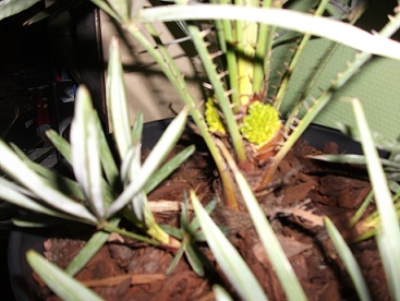 Ik heb hier in de winterstalling mijn Chamaerops humilis Cerifera die aan het bloeien is.