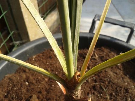 Hieronder een foto van de bladaanzet van de "cerifera". Er staan nergens stekels op de bladstelen en ook de overgang van de bladstengel naar het blad lijkt bij de cefifera meer op de overgang zoals die bij mijn Brahea dan die van de Chamaerops 'vulcano' die ik hier staan heb.
