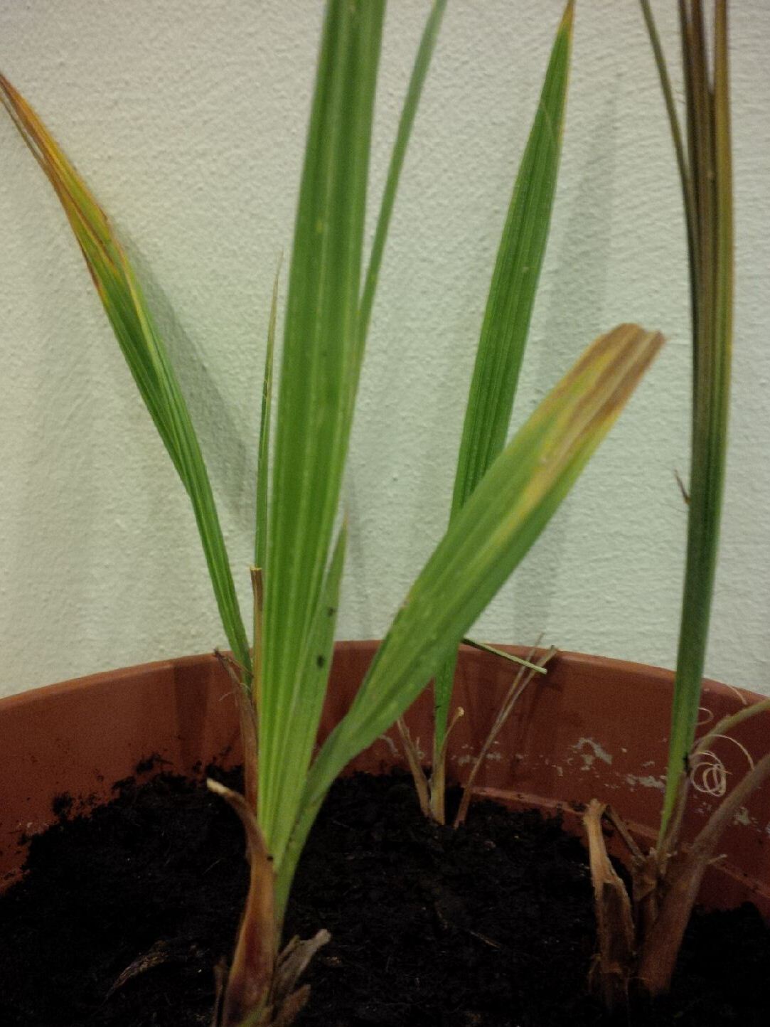 Dit zijn ze, ik heb de bruine bladeren weggeknipt, de overgebleven bladeren blijven nu groen. De speer is gegroeid zoals je ziet aan de zwarte streepjes (op blad en bij groeipunt). De andere zaailingen die geen kluitje hadden groeien niet.
