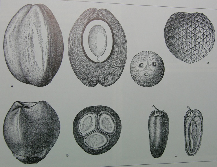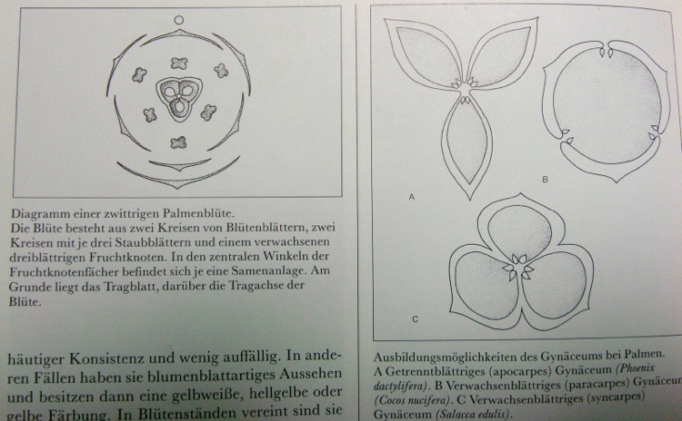 Bijgaande plaatjes en citaten uit Palmen... van Wilhelm Lötschert kunnen misschien een en ander verduidelijken. Een palmvrucht kan tot 3 zaden bevatten, maar ze kunnen ook versmolten zijn tot een enkel zaad zoals bij Cocos nucifera of gescheiden zoals bij Phoenix dactylifera. Als regel zijn er 3 meeldraden, maar bijvoorbeeld Phytelephas macrocarpa heeft er soms wel meer als 150. Foto 2 A t/m D, zaad van resp. Cocos nucifera, Arenga pinanga, Phoenix dactylifera, Coelococcus sp.