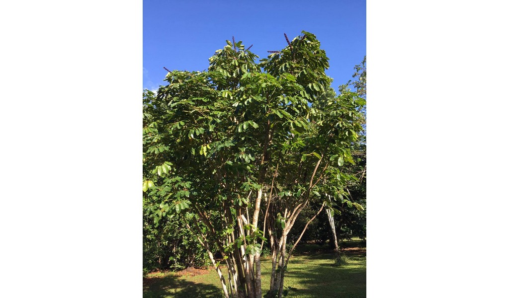 "Alpinia coerulea: Erect stems to 1,5 m rise from a creeping rhizome and bear large light green leaves in single plane(s) on opposite site of the stem." De bladeren van A. modesta zijn breed lineair en roodachtig aan de onderzijde.