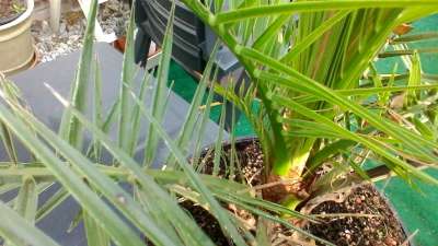 Daarnaast had ik een andere canariensis, met maar een heel beperkte aantasting van speerrot. Je merkt het wel nog aan het blad (dat toen aan het groeipunt zat), maar de palm groeit rustig verder. Zie 2de foto.