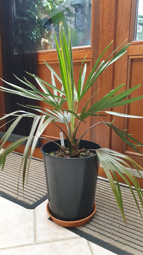 Livistona (mariae?) buiten geplaatst, 11e blad is aan het ontvouwen. Groei gaat gestaag door. 1 blad per 2 maanden sinds 25 Jan