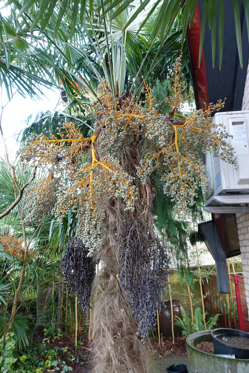 Trachycarpus fortunei met 'Winsan' blad hangt weer vol met afrijpende zaden. Aanvankelijk gebruikte ik pollen van een mannelijke wagnerianus maar die is sinds 2 jaar niet meer beschikbaar. De zaailingen onder de palm zijn nog van deze kruising. Ook zonder interventie krijgt de palm jaarlijks volop zaden sinds Trachycarpus hier overal zijn aangeplant.