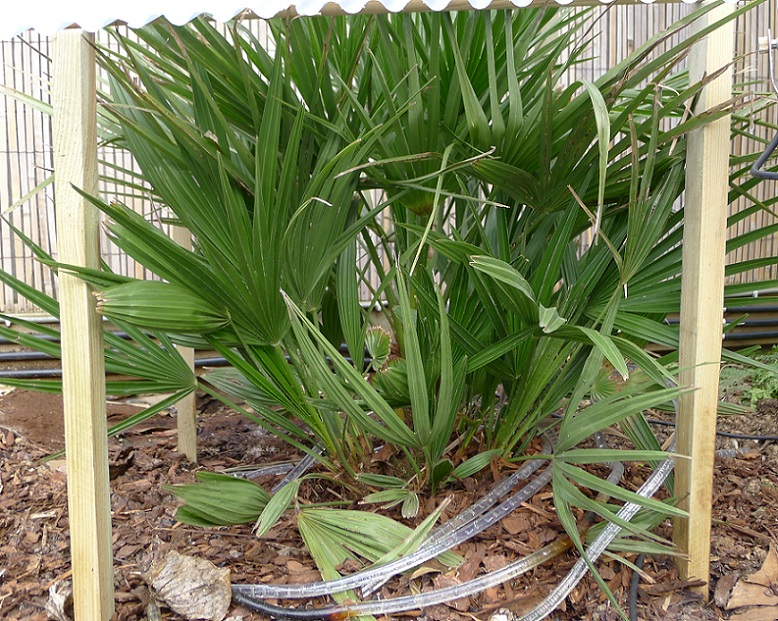 Mijn Chamaerops humillis 'Vulcano' planten staan onder een afdak met verwarming waar het minimum -2°C is. Ik durf ze niet onbeschermd laten staan omdat het vrij kostbare planten waren.