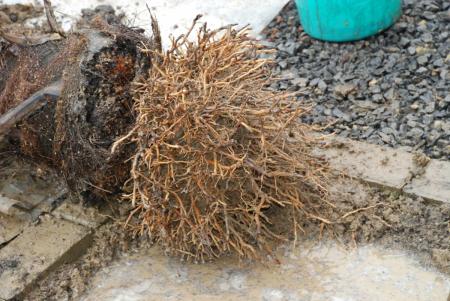 Eens thuis de 2 Trachy's natuurlijk in volle grond gezet (November????),maar na 2 dagen na wat forums bezocht te hebben ook verhalen van de bewuste kleiklomp.Ik wist direct dat dit bij deze exemplaren ook het geval was daar het echt beenharde klei was,de klomp woog meer dan de boom zelf dus ja.Dan maar alle klei weggespoeld en terug aangeplant en ondersteund voor de wind.
