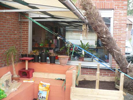 Heb vandaag mijn houten kuip al voor een deel aan het maken geweest. Hij is 100 x 100 en zal 90 cm hoog worden. Ik zal waarschijnlijk iemand moeten laten komen met en kraantje om hem in deze kuip te hijsen. De bedoeling is toch wel om verse potgrond onderaan in de kuip te plaatsen en de palm erbovenop te zetten zodat er heel veel nieuwe wortels kunnen aangemaakt kunnen worden. Koemestkorrels en palmbooster zullen de palm er wel bij helpen. Hij is echt wel te groot en te zwaar om dat manueel te doen. Wat wil je een palm met een stam van 185 cm en dan de wortelkluit erbij geteld is dit echt niet met de handjes op te tillen. Voor een tiental eurotjes wordt hij mooi in de bak geplaatst. Heb allesinds goed nieuws over de groei want daar is geen probleem mee, een nieuw blad wordt er al gevormd. Heb er wel 30 zwaar beschadigde door de voorbije winter verwijderd. Kzal nekeer zien om hier foto's te plaatsen...