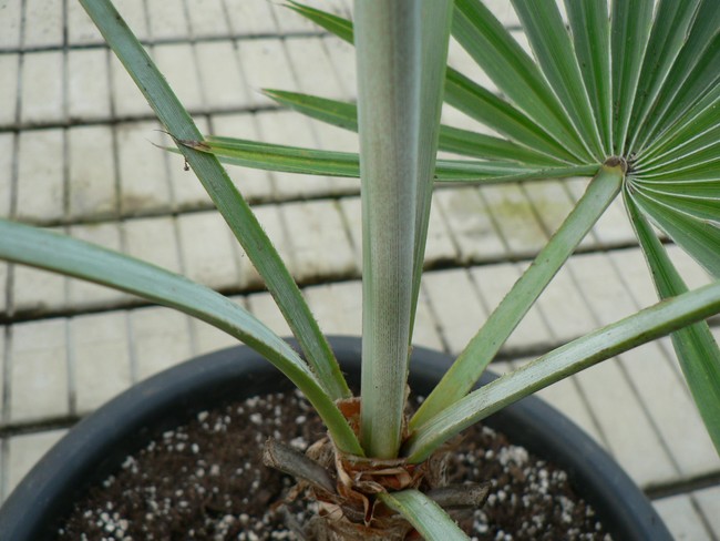 Ik dacht werkelijk dat ik deze 'soort' ook had, maar het blijkt de dulcis blue te zijn. Bij vergelijking zie ik overigens weinig verschil. De zaailingen van Brahea clara zijn hier zelfs blauwer van kleur(?)