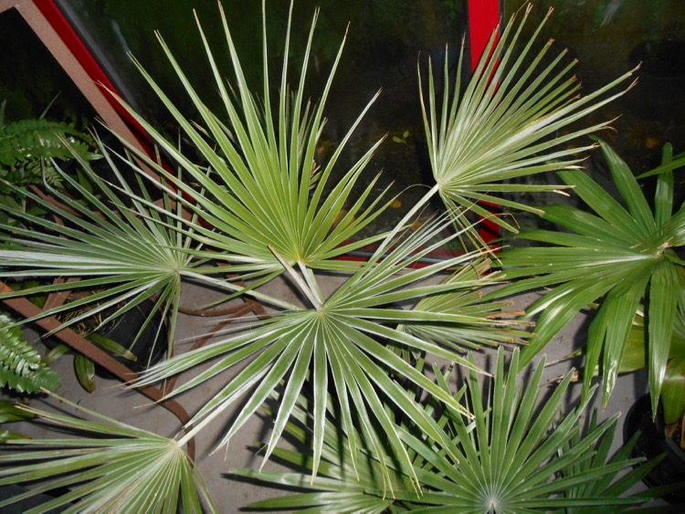 Bij de Cerifera verloopt de blauwgrijze kleur onder invloed van regen naar grijsgroen. Als de waslaag dunner wordt, schijnt het bladgroen erdoorheen. Een kruising tussen een 'groene' Chamaerops en de Cerifera levert een grijsgroene nakomeling. Deze hybride (?) dook op in de periode dat de Cerifera nog schaars was. Behalve de veroorzaakte ontkleuring lijkt de Cerifera niet bijzonder gevoelig voor plensregens. Bij Brahea armata is dat anders. Mijn ervaring is deze vergelen als ze teveel neerslag ontvangen. Rob duidt op eenzelfde verschijnsel bij Bismarkia, maar die is eigenlijk minder geschikt als kuipplant. Mijn Brahea armata stond vorige zomer in de kas omdat de hergroei na het verkuipen maar niet op gang wilde komen. Na dit zomerverblijf in de warme tot zeer warme kas had de plant al 2 nieuwe bladeren ontwikkeld. Komend seizoen ga ik het weer buiten proberen omdat bij een permanent verblijf in de kas de palm waarschijnlijk toch gaat rekken.