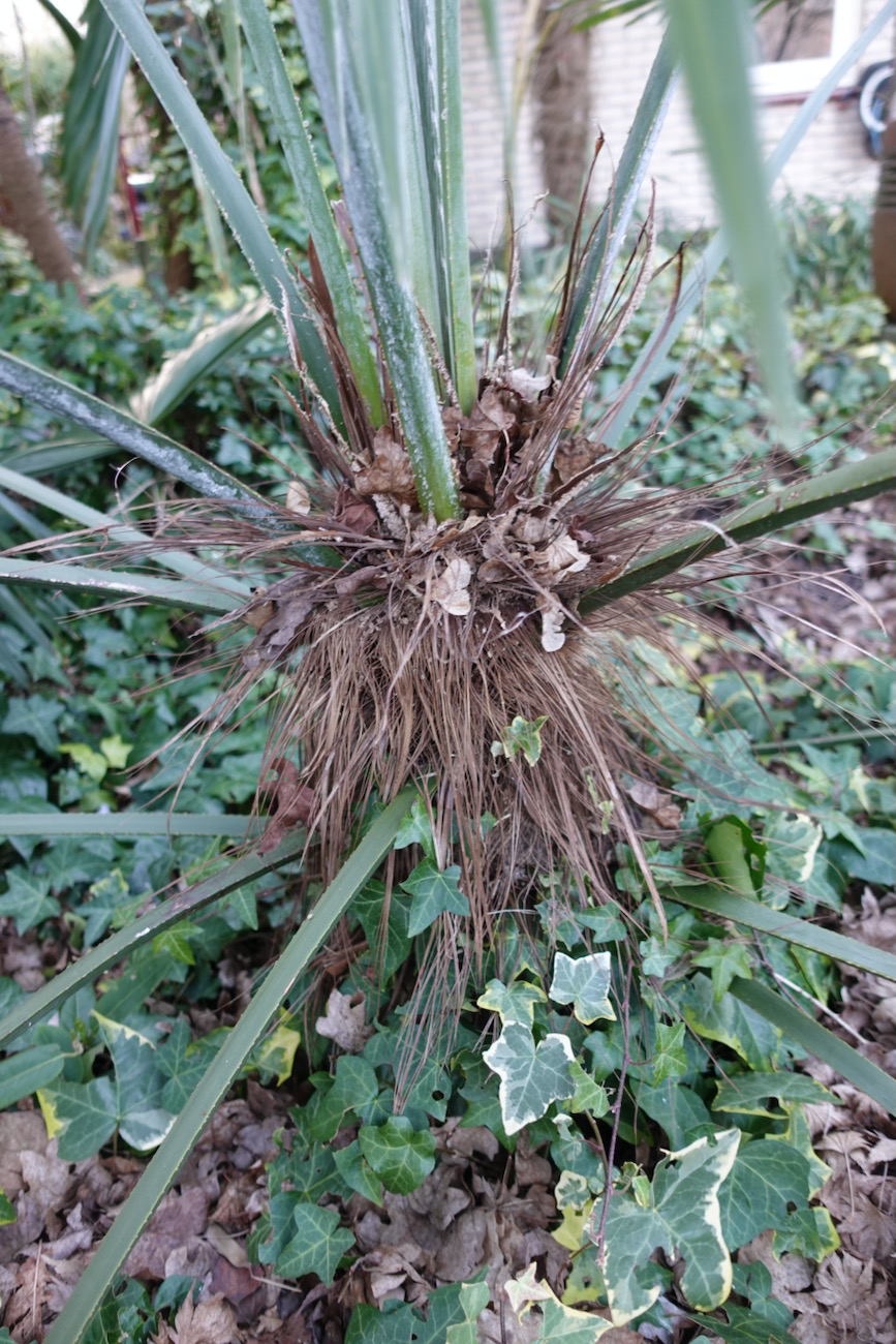 Trachycarpus princeps 'compacta'. Het lijkt mij een probleem met de beworteling? Uitgraven is een optie en het plantgat opnieuw inrichten. Bij palmen maak ik het plantgat zo diep mogelijk tot zo'n 60 cm. Wat versta je onder normale bemesting. Ik bemest tuinplanten nooit omdat de voormalige Zuiderzeebodem hier van nature veel voedingsstoffen bevat.