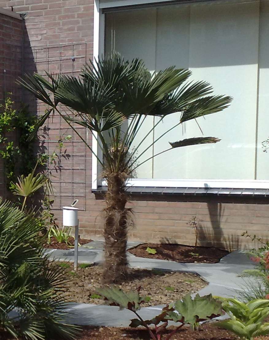 Krijgt weinig bescherming, eventueel een 'sjaal' van klimaatdoek om het bovenste gedeelte van de stam tijdens strengere kou.