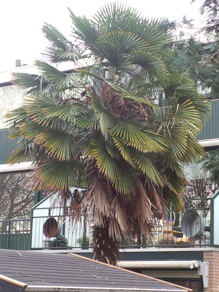 Voor de Amsterdammers, in de achtertuin van Konijnenbrug van gelijknamig tuincentrum in Amstelveen staat ook een flinke knaap, te zien vanaf het tuincentrum. In het westen hebben deze palmen weinig te duchten van de winters. De Trachycarpus van botanische tuin VU had zelfs geen bladschade in 2012. Volgens de hortulanus was de temperatuur er niet onder -10 °C geweest, terwijl de temperaturen plaatselijk in het binnenland onder invloed van een sneeuwdek tot onder -20 daalden. Trachycarpussen verloren daarbij massaal hun blad. Desondanks overleefden er een flink aantal. Zo niet een omvangrijk exemplaar in Dronten. De foto hiervan is onvindbaar, maar de zoektocht in mijn archief leverde wel een prent op van de Trachycarpus op Fort Hoofddijk in 2006. Deze palm stond daar voorheen als kuipplant 's winters in de koude kas, maar werd begin deze eeuw in de volle grond gezet tegen de zuidhelling van het fort. Een uitgeplant exemplaar in de koude kas moest tenslotte worden gesloopt.