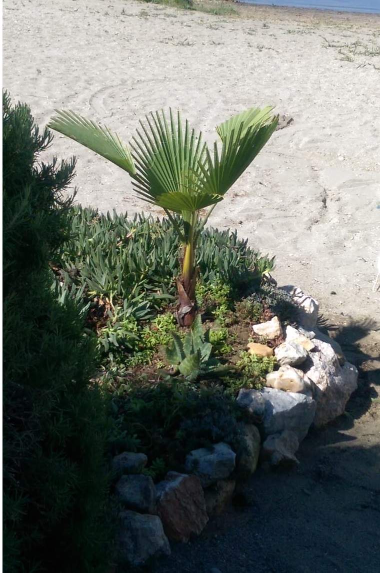 Helaas is er geen andere plek met genoeg ruimte. Op zich komen ze hier vaak voor. Ook op open plekken. Je ziet washingtonias hier zelfs in stoepranden uitzaaien. Ik twijfelde nog tussen deze of een chamaerops. Had in achteraf mischien beter kunnen planten. Die worden vaker hier met succulenten gecombineerd. Maar goed.