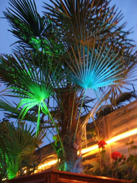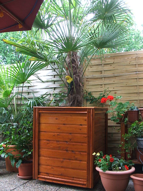 palm te krijgen, want ik vindt die lange stammen met zo'n groen dopje er bovenop helemaal niet mooi, en heb ik liever dat het bladerendak net boven de schutting uitsteekt om zo wat meer privacy
