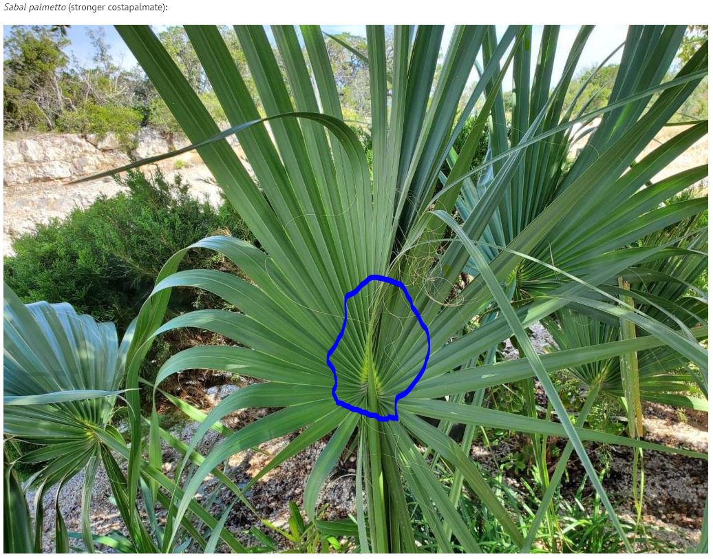 Blauwe cirkel laat de verschillen zien van de uiteinde van bladsteel (costapalmate)