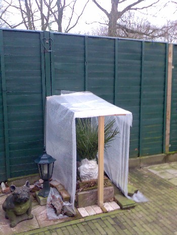 Daarnaast lijkt ook de aanplant tijd uit te maken, met winters zoals de voorgaande. De palm die hier onbeschermd overleefde staat er al sinds 2004 en ook de cerifera die onbeschermd overleefde stond er sinds 2006. Ik had in het voorjaar van 2009, nogmaals normale, cerifera en vulcano geplant en allen hadden speerrot na de winter van 2009-2010. De lengte van de kou lijkt bij onbeschermde exemplaren dan direct zijn tol te eisen. Dus mijn advies is tot op heden ook, zoek een zo gunstige mogelijke standplaats als je naar je eigen zeggen zacht genoeg woont gedurende de winter om een Chamaerops onbeschermd de winter door te krijgen. De eerste winter voorzien van een afdak, zeker met winters zoals de afgelopen 2 of zo'n december maand van deze winter.
