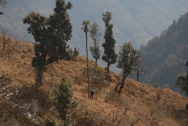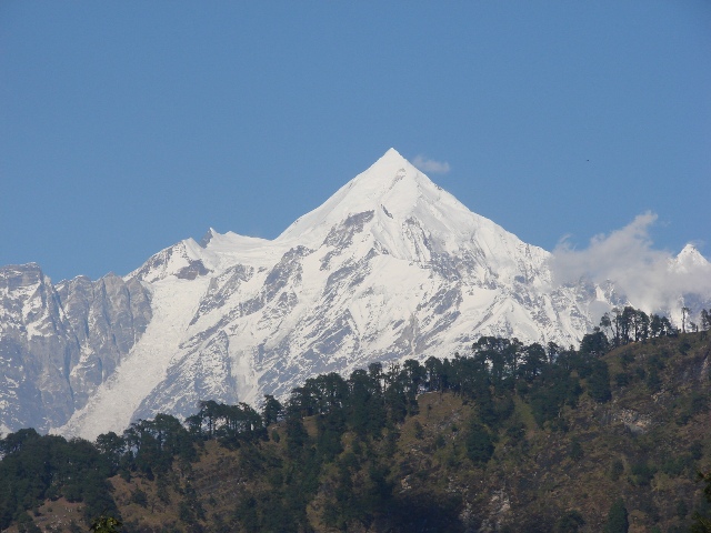 Bijgaand nog een plaatje van een takil waarop je kan zien dat de stam helemaal niet dun hoeft te zijn en een plaatje met de achtergrond waarschijnlijk Panch chuli (+/- 7000 meter hoog, genomen foto is vanaf staanplaats takil)